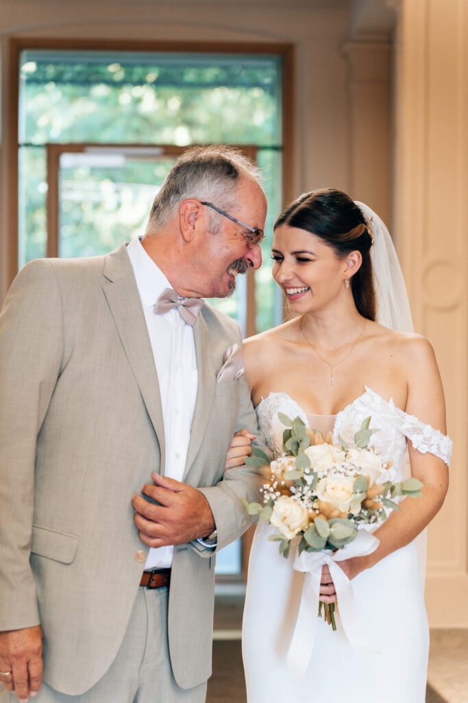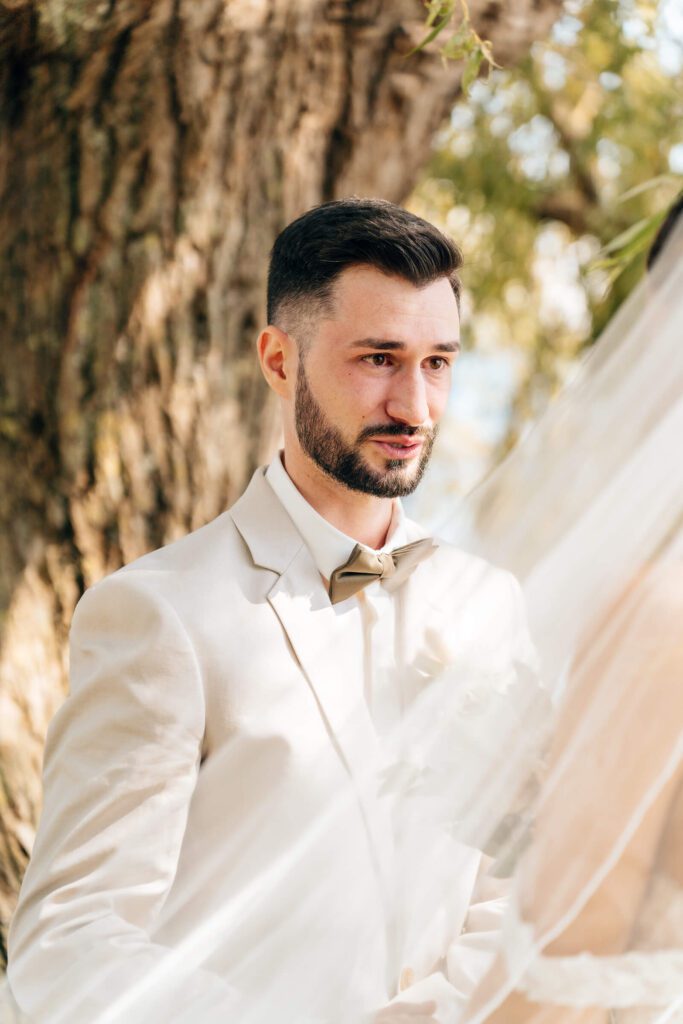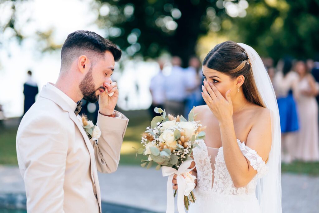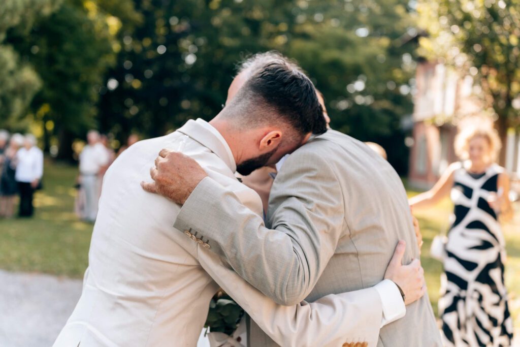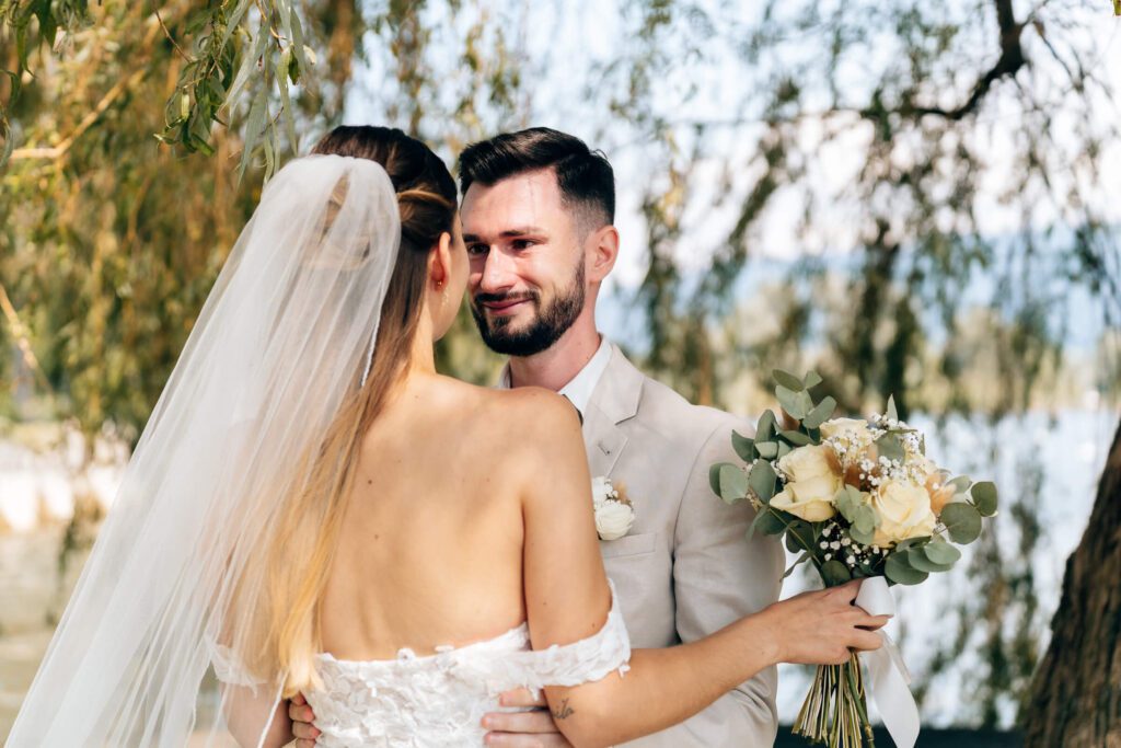 Noch vor der Trauung trafen wir uns im Toskana Park. Unter einer großen, alten Weide wartete Patrick auf seine Isabelle – sichtbar aufgeregt, voller Vorfreude. Als sie ihm sanft auf die Schulter tippte und er sich umdrehte, war der Moment da. Dieser eine Augenblick, in dem alles still wird. Seine Braut stand vor ihm – wunderschön, strahlend, ganz da. Ein emotionaler First Look, der beiden noch lange in Erinnerung bleiben wird.