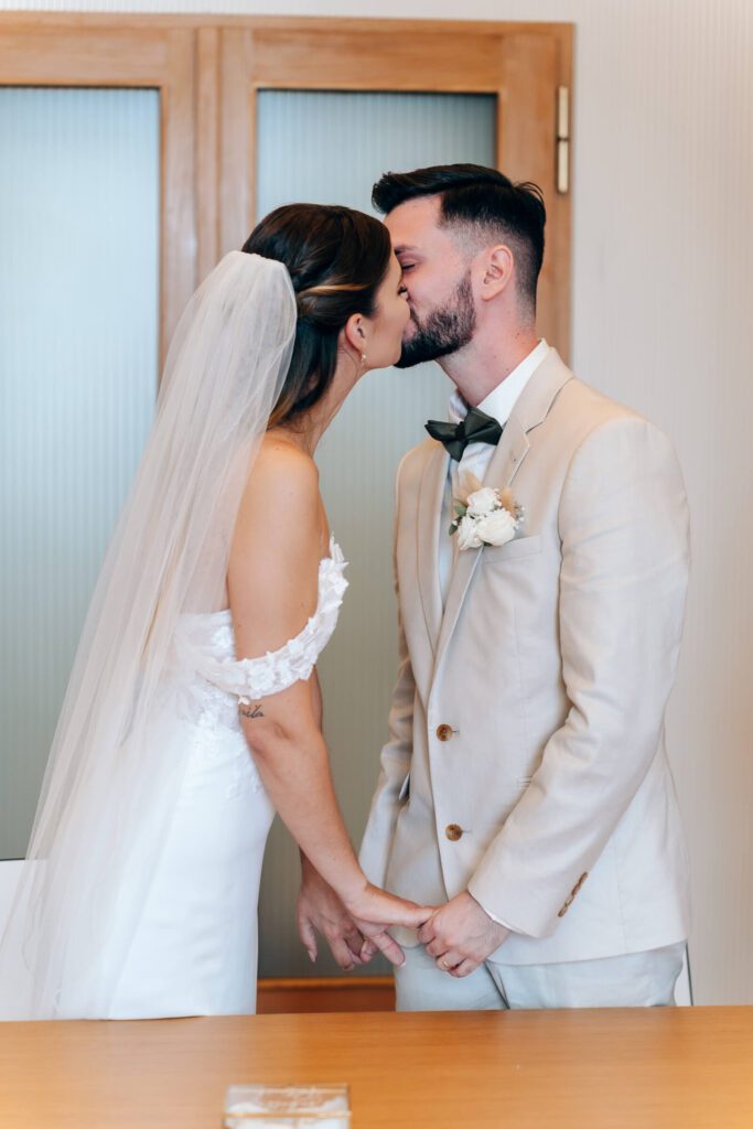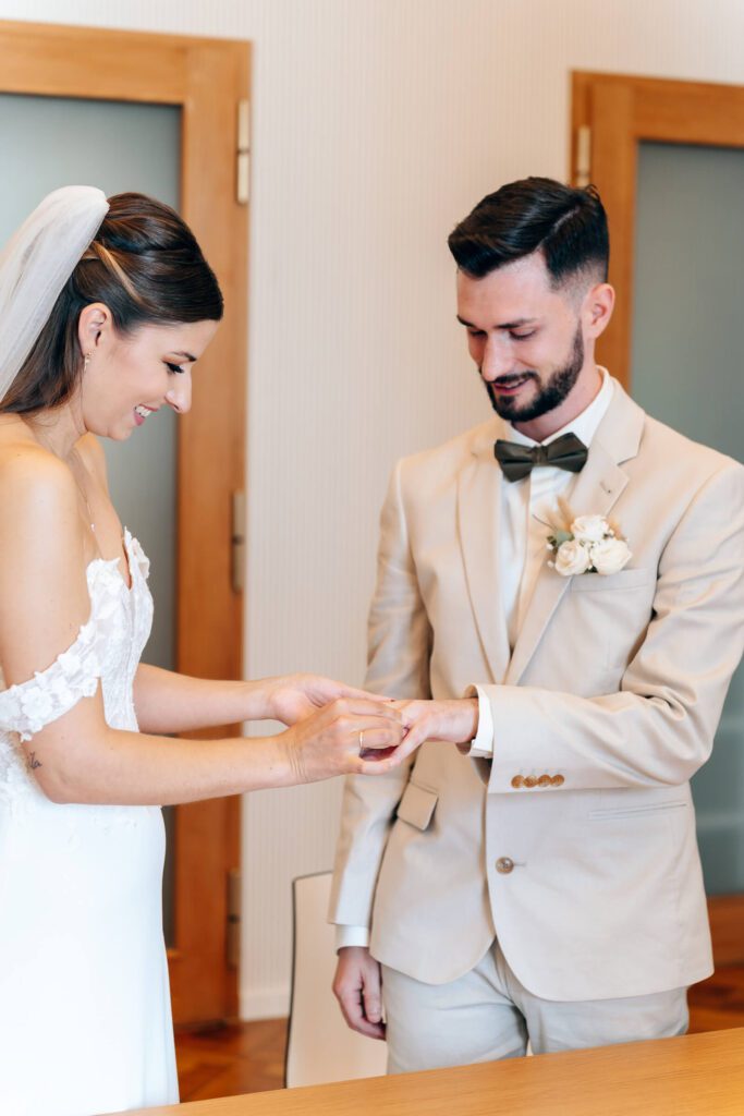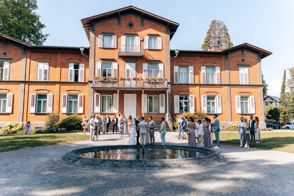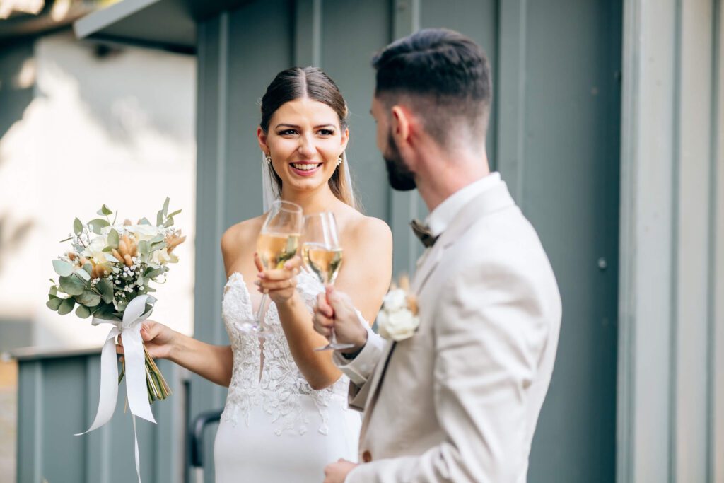 Die Trauung fand im nahegelegenen Standesamt in Lindau statt. Die Stimmung war herzlich und fröhlich, begleitet von Lachen, liebevollen Blicken und ehrlicher Freude. Danach ging es direkt zum Sektempfang: anstoßen, gratulieren, umarmen – diese kleinen Momente, die eine Hochzeit so lebendig machen.