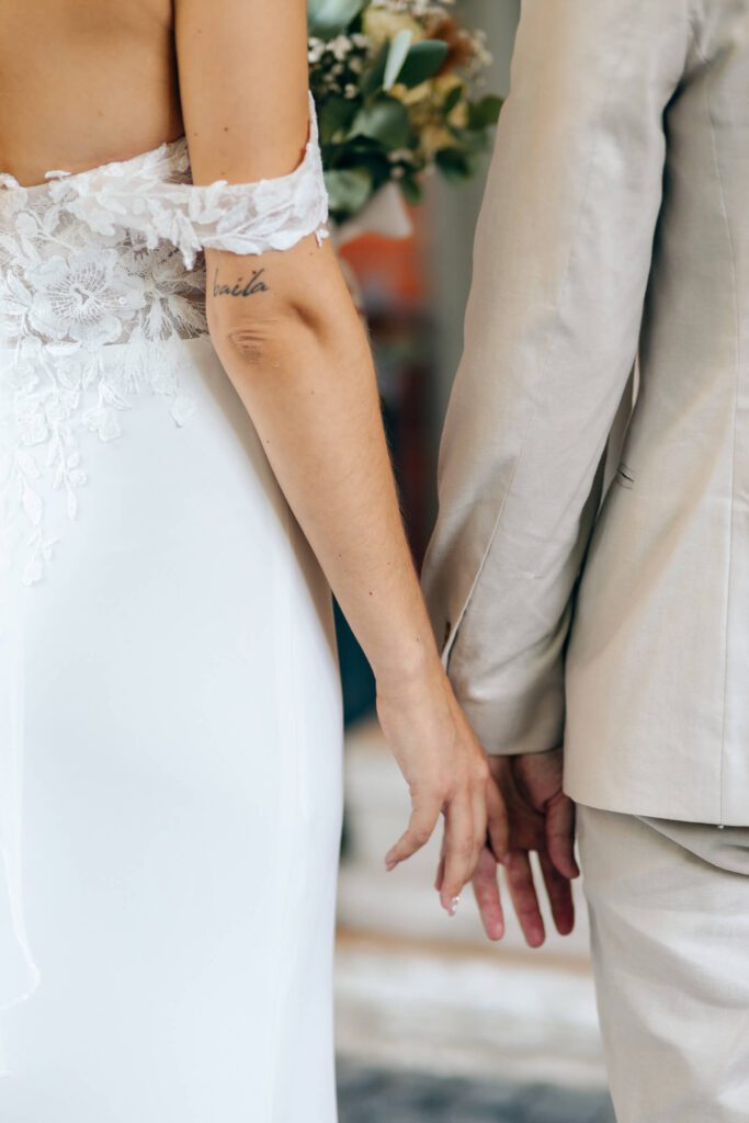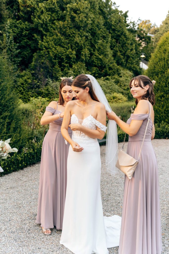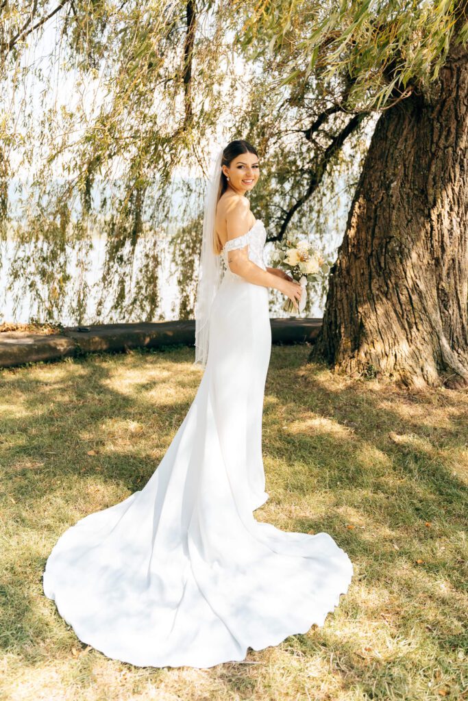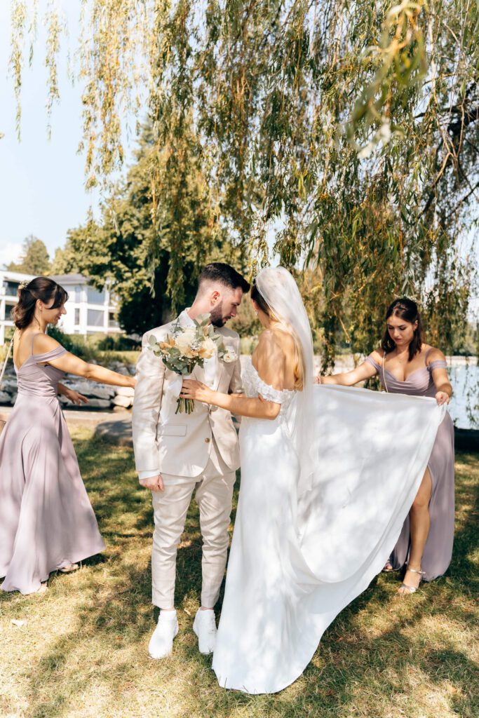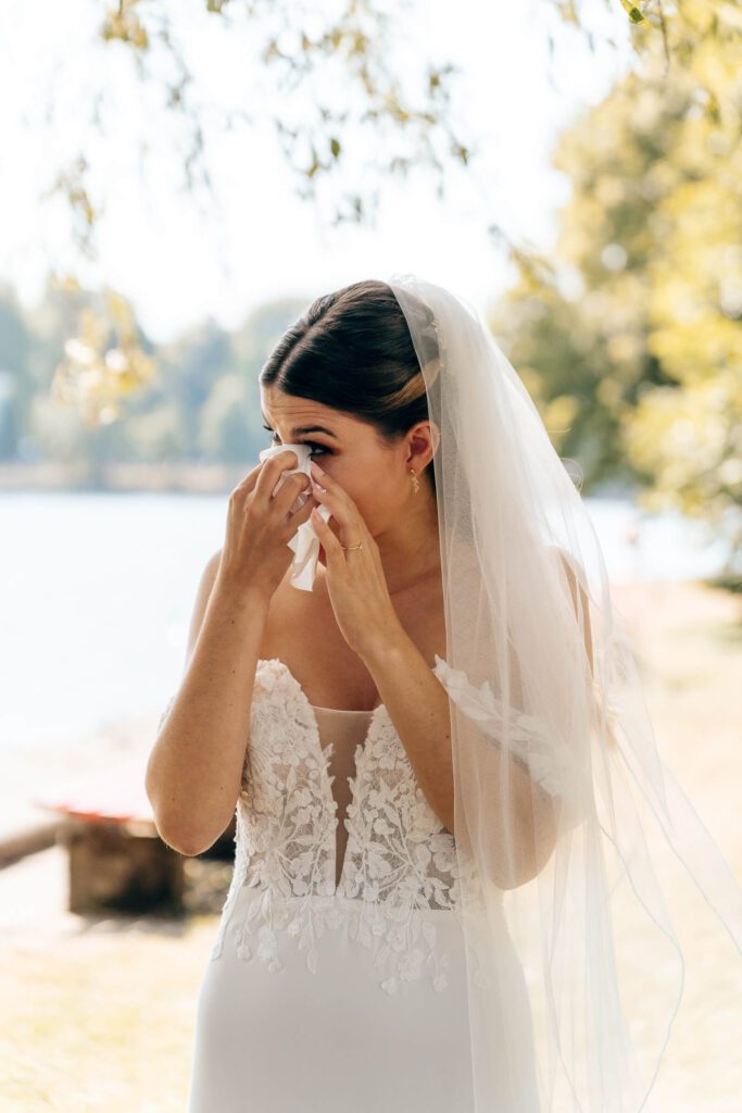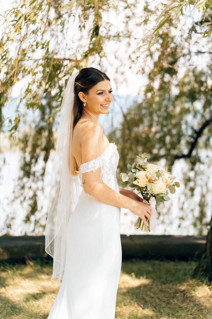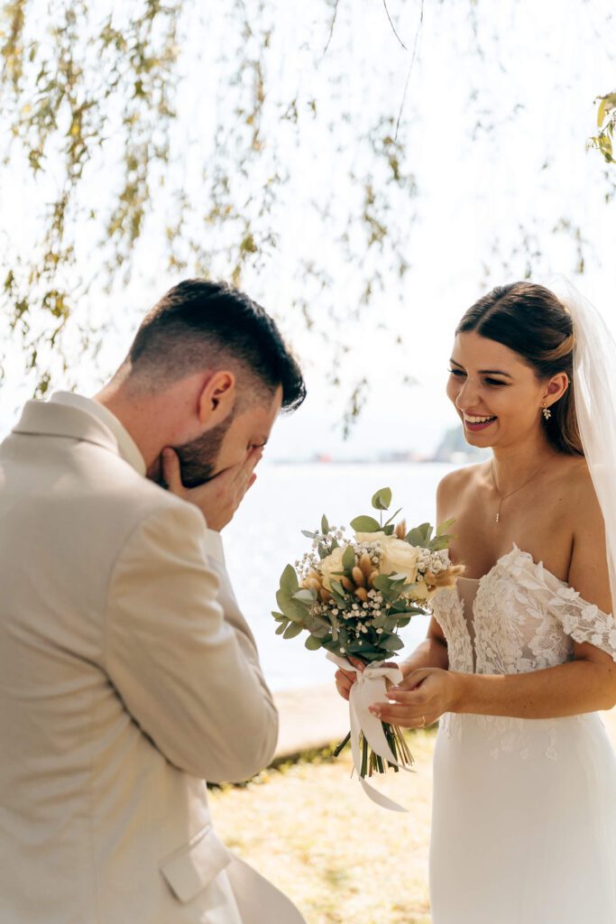 Die Zeit bis zur Trauung nutzten wir für erste Brautpaarbilder unter der Weide und ein entspanntes Beisammensein mit den Trauzeugen. Alles fühlte sich ruhig und leicht an – genau so, wie ein Hochzeitstag am Bodensee sein darf.